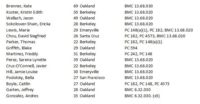 The following is a partial list of arrestees. Some arrestees names have not yet been confirmed.