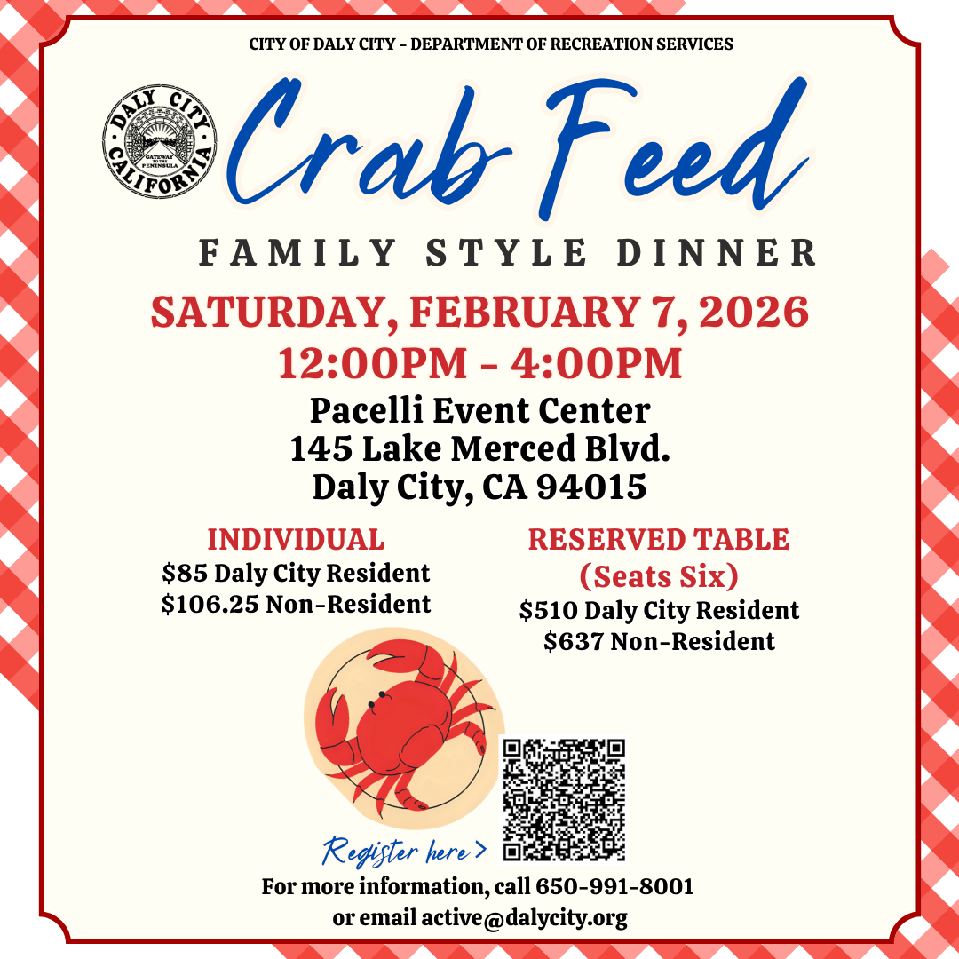 Please join the City of Daly City - Department of Recreation Services for Crab Feed 2026 on Saturday, February 7, 2026, from 12:00 p.m. to 4:00 p.m. at the Pacelli Event Center (145 Lake Merced Boulevard). For more information and ticket pricing, please visit www.dalycity.org/Crab-Feed-2026.